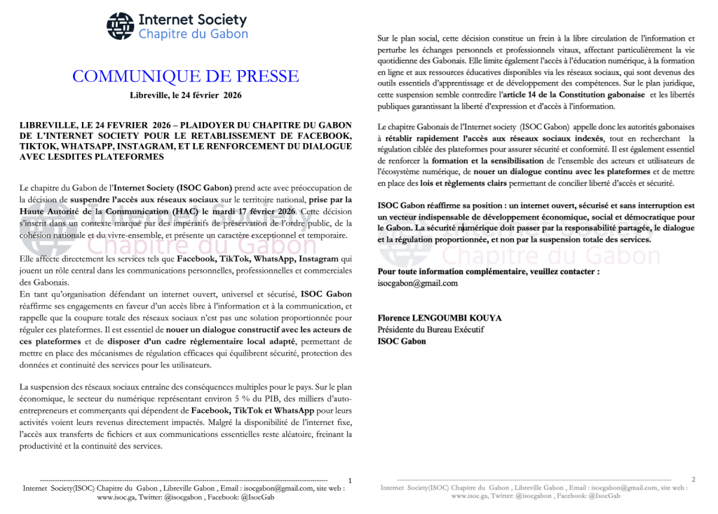 COMMUNIQUE DE PRESSE LIBREVILLE, LE 24 FEVRIER 2026 – PLAIDOYER DU CHAPITRE DU GABON DE L’INTERNET SOCIETY POUR LE RETABLISSEMENT DE FACEBOOK, TIKTOK, WHATSAPP, INSTAGRAM, ET LE RENFORCEMENT DU DIALOGUE AVEC LESDITES PLATEFORMESLe chapitre du Gabon de l’Internet Society (ISOC)